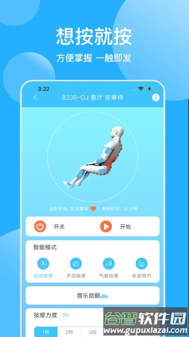 顾家按摩椅手机版是顾家官方推出的智能按摩设备连接应用,用户能够通过手机直接操控家中的智能按摩仪,平台内置多项实用功能,包括一键开关控制、助眠音乐播放等,帮助用户获得个性化的按摩体验,轻松享受舒适放松时光。