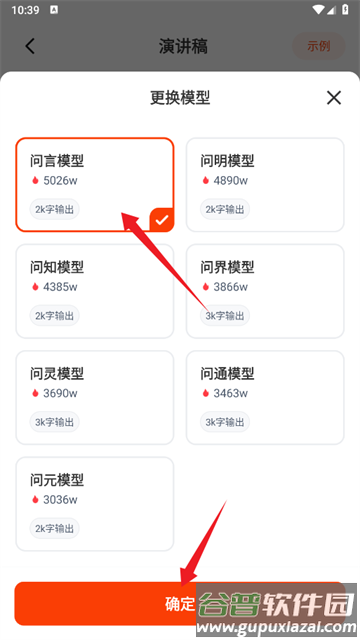 4、以撰写演讲稿为例,首先选择模型,从列表中选取合适模型并确认使用。