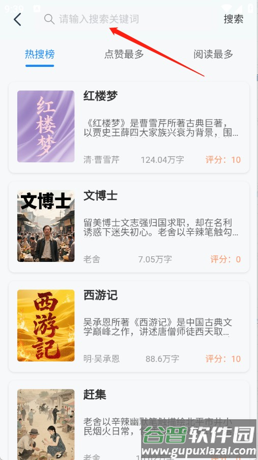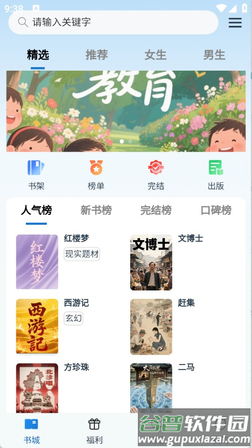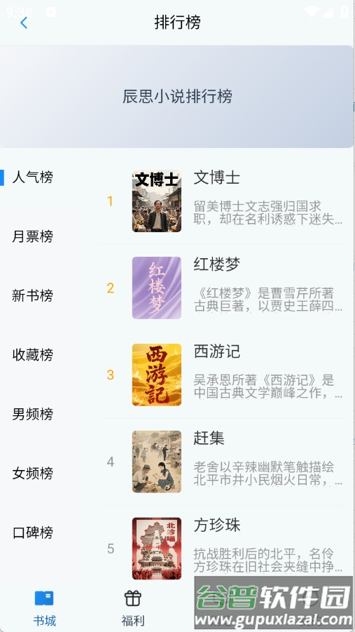 2、书城页面包含大量小说资源,设有人气榜、新书榜及完结榜等多个分类;