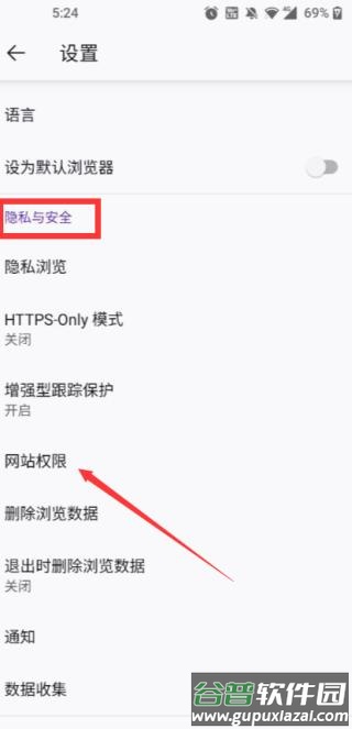 3、选择“隐私与安全”分类,里面包含网站权限管理,可以调整网页访问设置。
