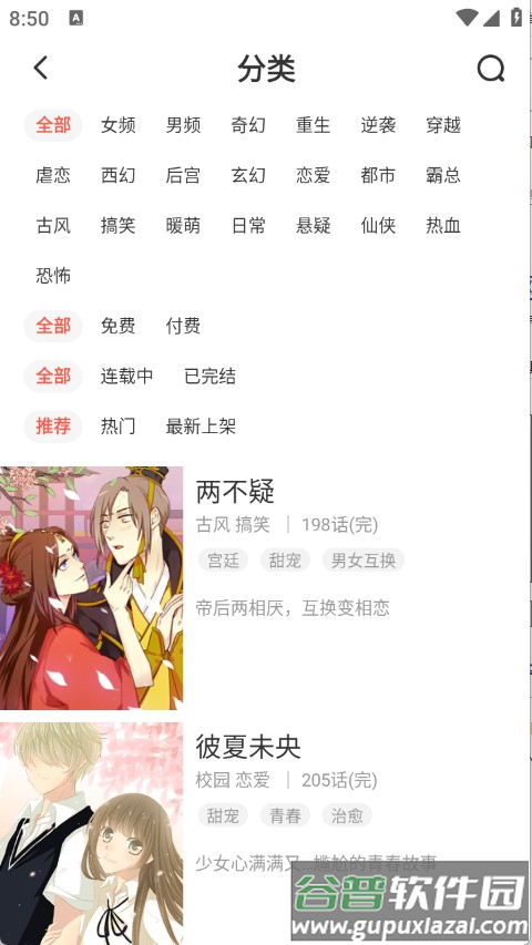 3、分类页面将所有漫画按题材和风格做了详细划分;