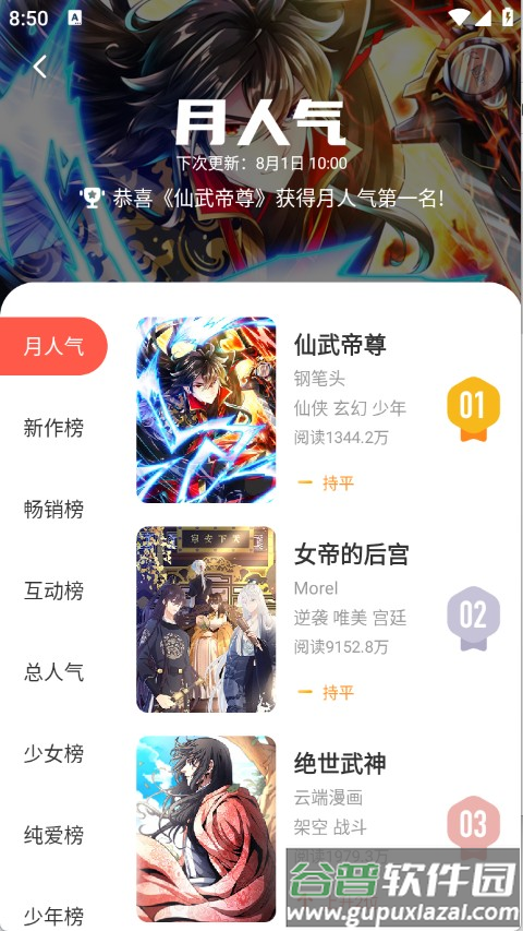 4、排行榜根据当前阅读热度对漫画进行排序;