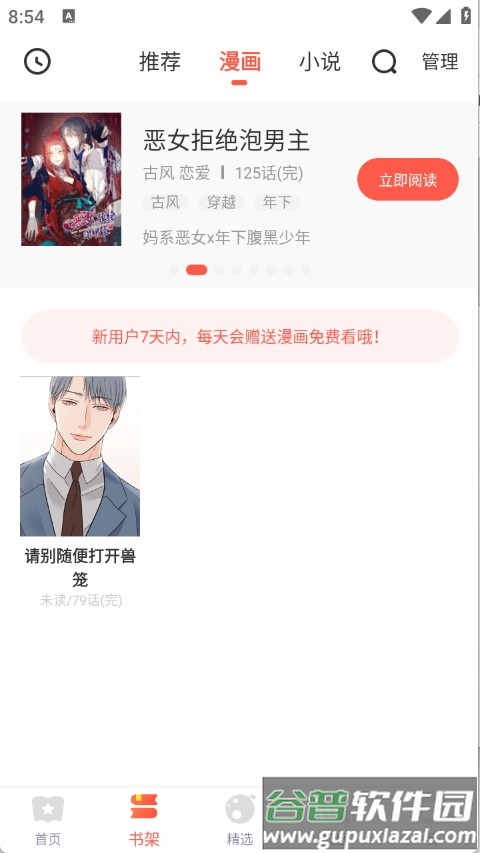 3、返回首页,可以在书架栏目中查看已收藏的漫画。