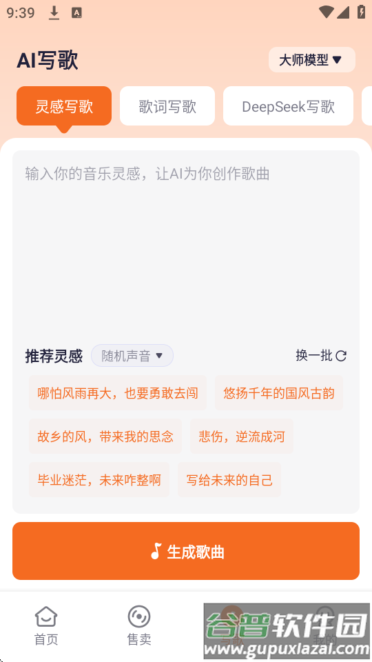 2、在创作页面选择灵感写歌模式,输入关键词或句子内容,点击生成按钮即可得到完整歌曲;