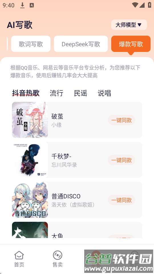 5、爆款写歌模块提供热门模板,点击即可创作同类型作品;