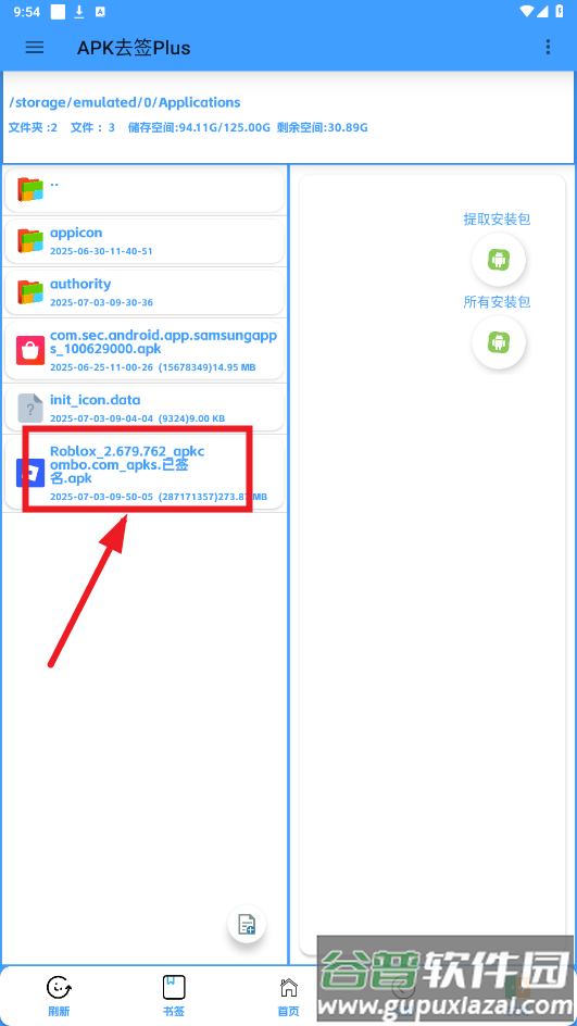 2、在文件列表中找到需要处理的apk文件,点击选中目标文件。