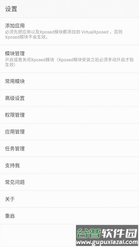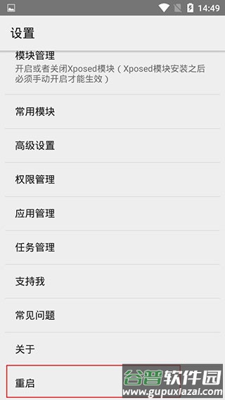 7、模块配置完成后,需重启VirtualXposed使其生效,只需在主页进入设置界面点击重启即可。