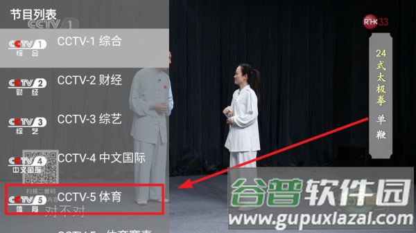 3、点击屏幕中央区域调出频道列表,选择CCTV5体育频道;