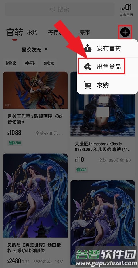 1、打开首页后,点击右上角的加号按钮,选择“出售商品”选项。
