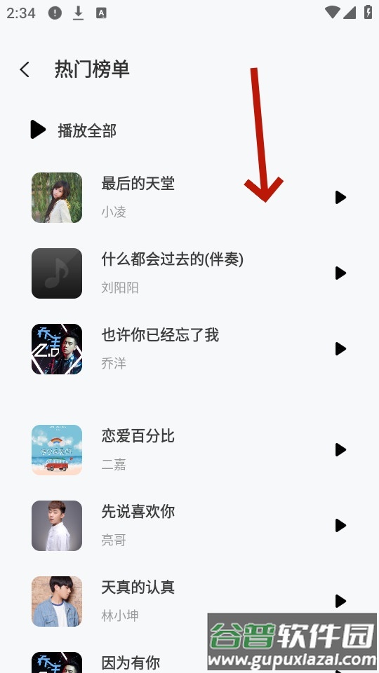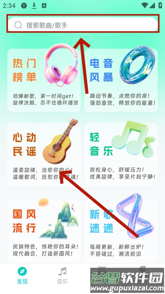 2. 在顶部搜索框输入歌曲或歌手名称,也可直接查看各类榜单;