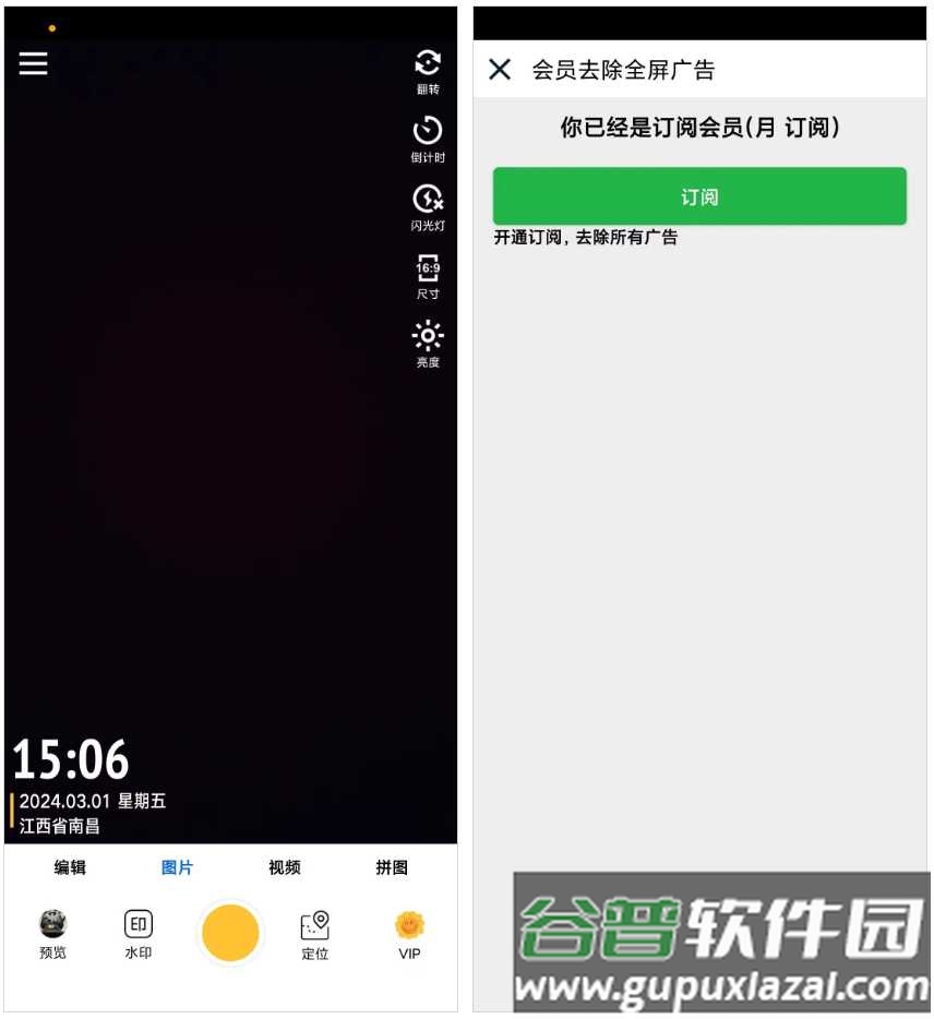当前版本已解锁会员订阅权限,去除全屏广告,启动后直接进入水印拍摄界面,支持照片与视频拍摄,内置丰富水印模板;提供自定义定位、时间及水印等功能,操作便捷。