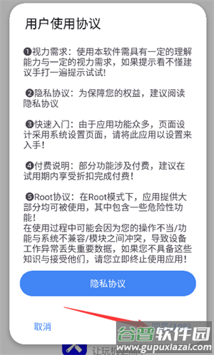 1、安装完成后打开应用,阅读并同意用户协议;