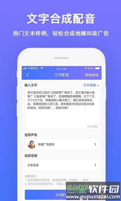 4. 文字合成配音:内置热门文本案例,轻松制作促销语音。