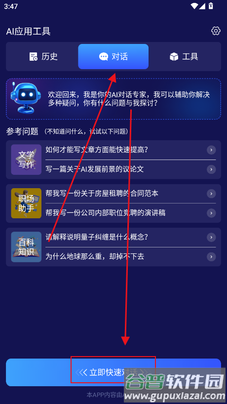 2、进入对话页,点击立即快速对话即可开始交流;