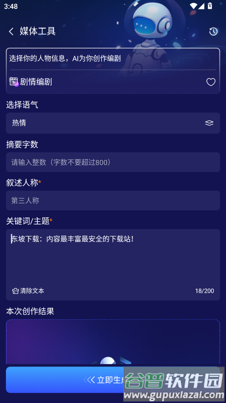 2、高效便捷创作:软件能够协助编辑剧情、编写视频脚本、整理报告结构,适用于各行业用户;智能系统输出内容完整,减少后期修改时间,满足日常创作需要;用户可自定义指令生成个性化内容,结果即时呈现并支持一键复制。