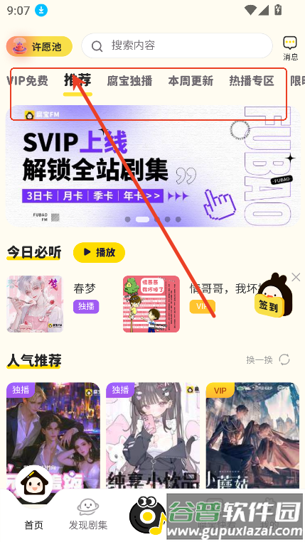 1、打开腐宝FM应用,在首页挑选感兴趣的有声频道;