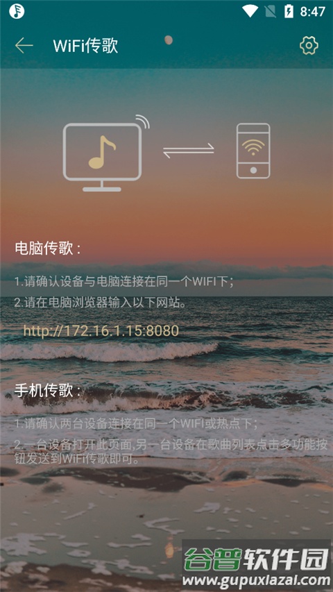 (1)电脑传歌:确保电脑与手机处于同一WiFi网络下;在电脑浏览器中输入APP显示的地址,即可上传歌曲文件。