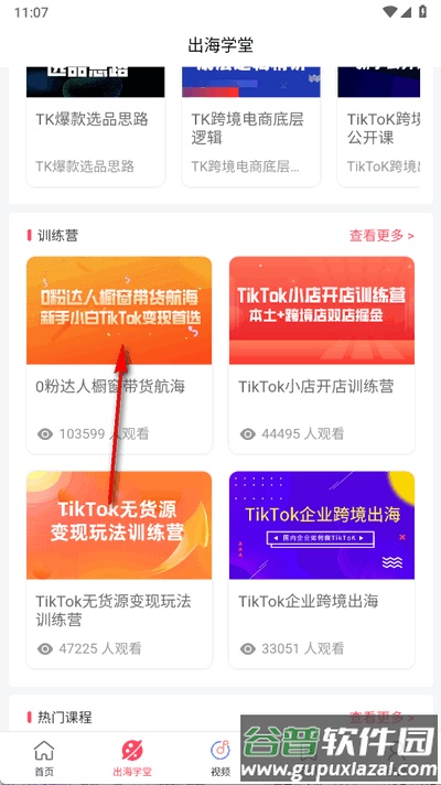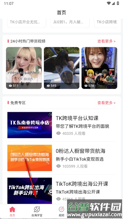 1、打开软件进入首页,点击底部导航栏的“出海学堂”。