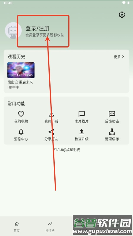 2、在个人中心页面点击“登录/注册”选项;