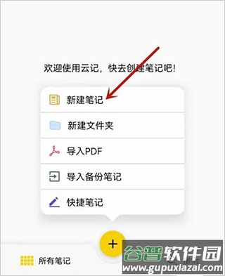 二、在上拉菜单中,可以看到云记能新建的文件类型;以“新建笔记”为例,点击如图红箭头所示的“新建笔记”,进入新页面。