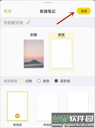 三、进入新页面后,选择笔记封面和纸张格式,点击如图红箭头所示的“完成”,即可进入笔记页面。