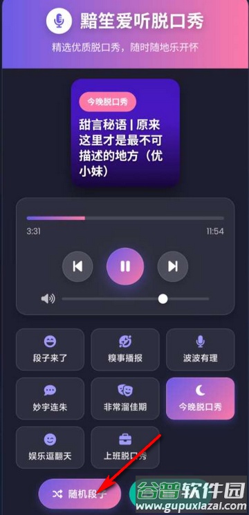 专门用来听脱口秀的平台黯笙脱口秀app是为喜爱脱口秀的听众设计的。它汇集了多个来源的脱口秀节目内容,例如段子来了、波波有理、今晚脱口秀和非常溜佳期等知名作品。用户可以选择随机播放,也能依据个人偏好挑选特定平台的内容进行收听。