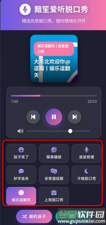 1、完成软件下载并安装后,打开应用即可选择喜欢的脱口秀类型。