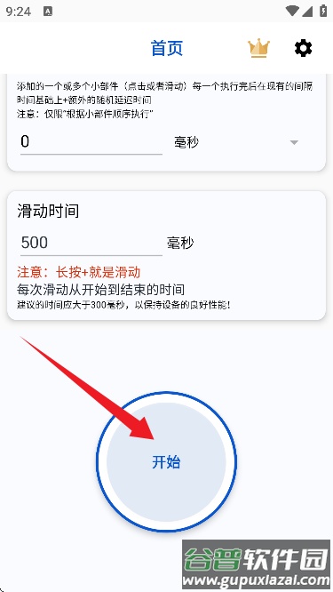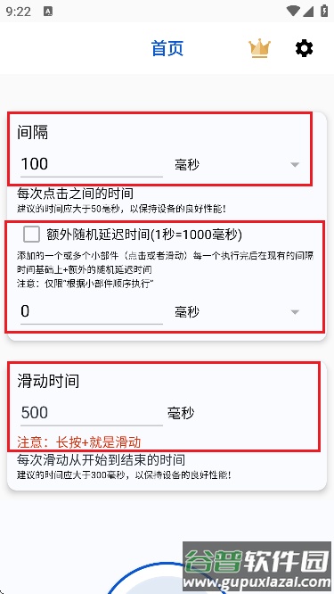 3、在首页中可预先设置点击间隔时长、延迟时间以及滑动持续时间;