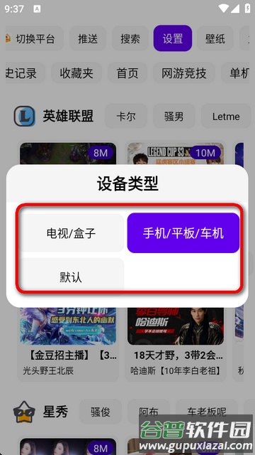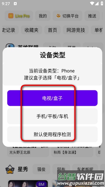 原版HuyaTV已停止更新,现更名为“FUSE”,不再支持安卓4.x设备;软件启动后会提示选择当前使用设备,选择后进入主界面。