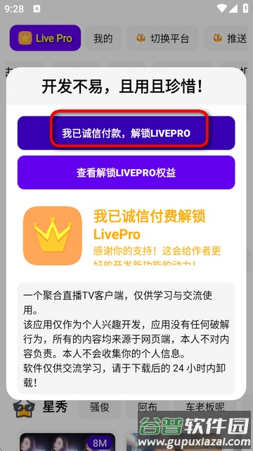 3、点击左上角的Live Pro选项,然后选择“我已诚信付款”来解锁Live Pro功能。
