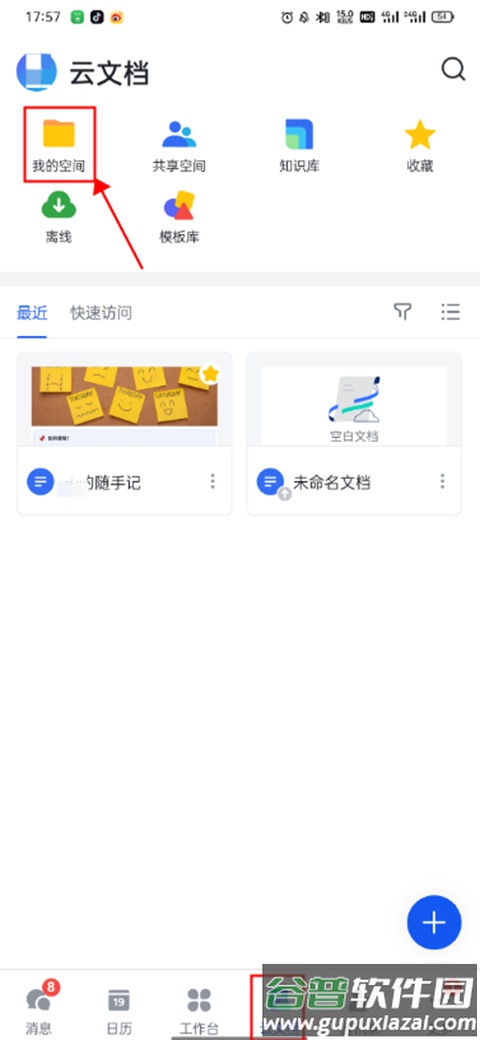 1. 在飞书苹果版中进入“云文档”页面,点击“我的空间”。