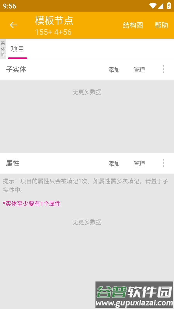 3、在模板节点界面添加子实体和属性,点击右上角的结构图。