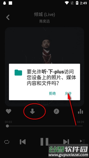 3、打开目标歌曲播放界面,点击下载按钮,按提示授予软件所需权限;