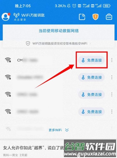 2、启动应用后,界面会显示当前可用的无线网络,点击免费连接按钮。