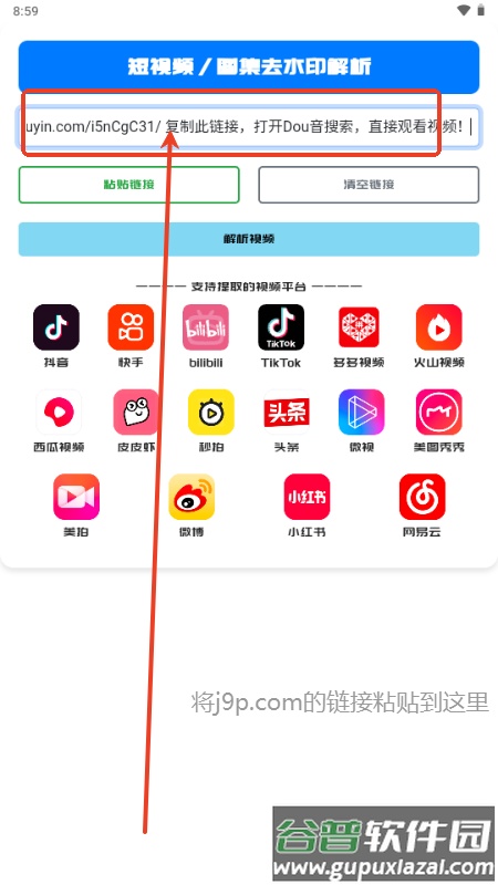4、将复制的链接粘贴到软件解析工具的输入框中;