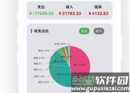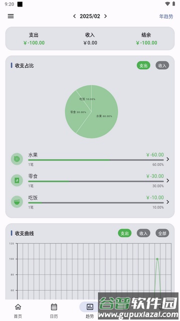 6、点击底部趋势按钮,可查看收支比例图表、收支曲线等统计信息。