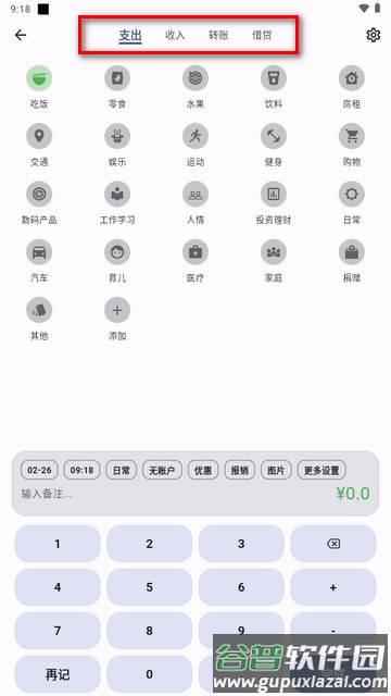 3、依据实际消费、收入、转账或借贷情况,选择对应类型并输入金额。