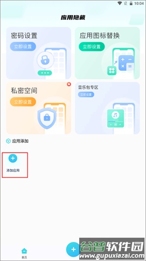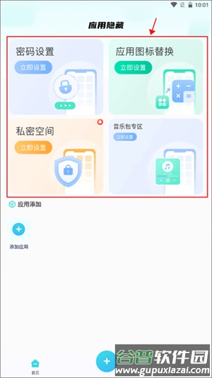 3、在首页可以看到多种功能选项,包括密码设置、应用图标替换、私密空间等,这里以“应用图标替换”为例进行说明。
