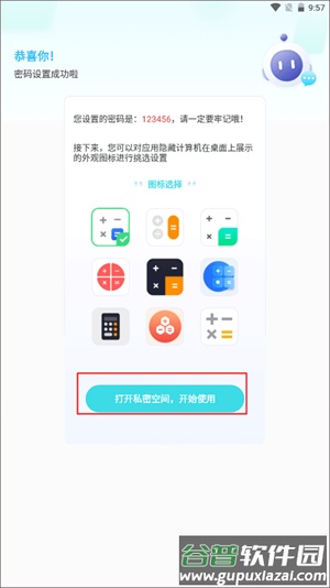 2、界面会提示刚才设置的密码以便记忆,确认无误后点击下方“打开私密空间,开始使用”按钮。