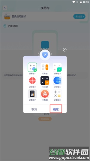 4、点击右上角“去挑选”按钮,从多种计算器图标中选择一款喜欢的样式作为伪装图标。