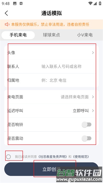 4、填写具体的电话号码与通话内容,点击【立即创建】即可查看高度仿真的模拟效果。