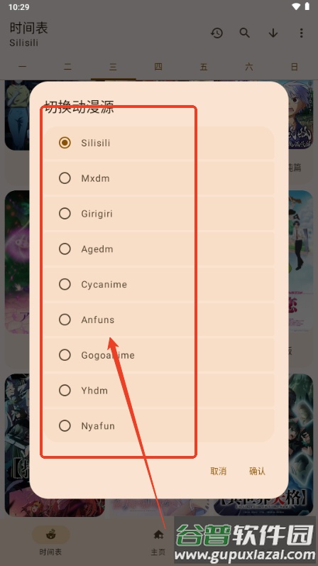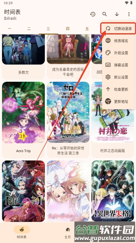 2、在弹出的菜单列表中,选择“切换动漫源”选项;