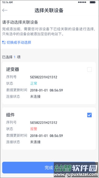 6、若选择手动关联设备,需自行将采集器下已完成物理连接的设备添加至电站;如果网络采集器未正常联网或部分设备未连接,可等待设备正常工作后,前往电站设备信息页面再次手动添加。