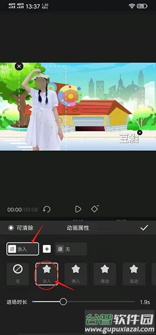 3、点击【进】,挑选一个进场动画样式,拖动时间调节按钮设置动画时长。