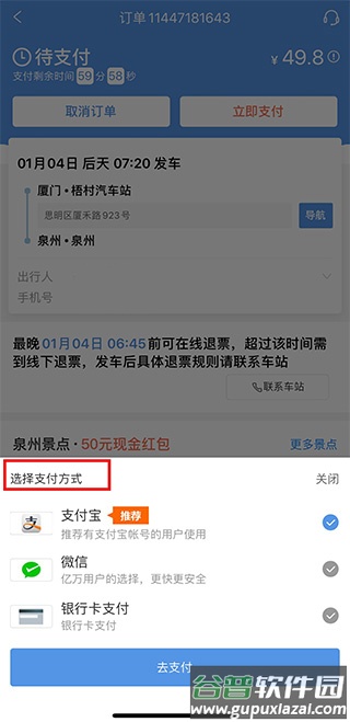 6. 选择支付方式完成付款,汽车票购买即告成功;您可以在“我的订单”中查看已购车票。