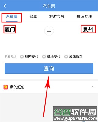 2. 选择汽车票,填写出发站、到达站以及出发日期,然后点击查询。