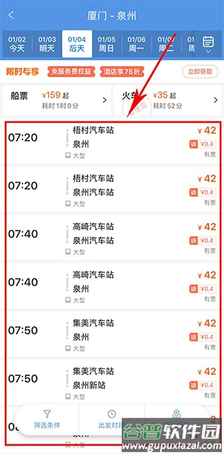 3. 页面将展示符合条件的车次信息,您可选择不同时间或车站的车票,点击有票的车次即可预订。