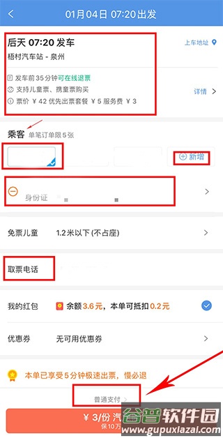 5. 填写乘客姓名、身份证号与手机号,并确认取票电话;仔细核对信息后,选择普通支付或按需加购汽车保险。