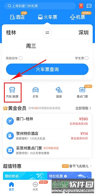 1. 在首页点击“汽车/船票”入口。