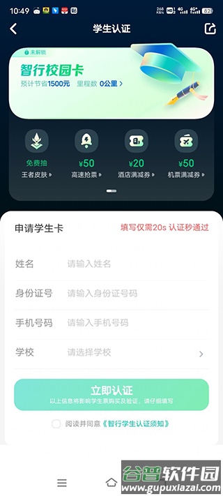 进入认证页面,填写学校信息及个人身份信息,点击立即认证。